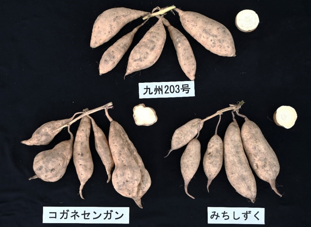 サツマイモは、南九州の基幹作物として農業生産ならびに地域経済において重要な品目となっており、南九州におけるサツマイモ生産量の7割以上がでん粉と焼酎の原料として使われています。しかし、サツマイモ基腐病(以下、基腐病)の発生により南九州のサツマイモ生産は深刻な被害を受けました。基腐病対策の推進により被害は減少傾向にあるものの、生産者の高齢化に伴う栽培面積の減少も相まって生産量は十分回復しておらず、とりわけでん粉の原料不足はいまだかつてない深刻な状況にあります。また、南九州では、基腐病を原因としない塊根腐敗症状の発生も問題となっています。この課題に対応するため、農研機構は、2021年に育成した「みちしずく」に続く原料用の基腐病抵抗性品種の第二弾として、「コガネタイガン」を育成しました。