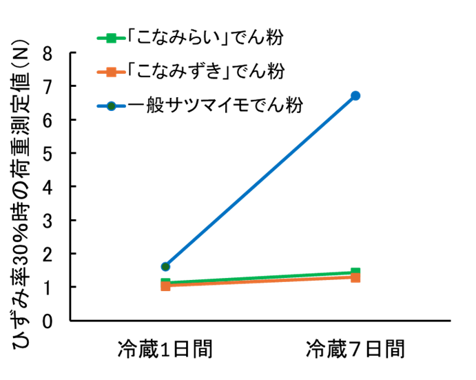 • 「こなみらい」のでん粉は、「こなみずき」と同様、耐老化性が優れます。でん粉ゲルを低温で保存しても水分が保持され、硬くなりにくいため、ぷるぷるとした瑞々しい食感が長持ちするといった食感改良効果や品質保持効果があります(表2、図2、3)。