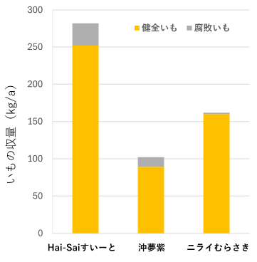 図2 「Hai-Saiすいーと」、「沖夢紫」および「ニライむらさき」の基腐病発生ほ場における収量性(令和3年~令和6年の春植え栽培における平均値)