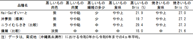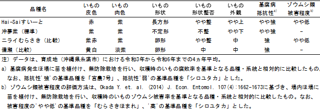 - 「Hai-Saiすいーと」は、沖縄県で古くから栽培されている白皮・紫肉色の在来品種「備瀬」を母親とした自然交雑種子7)から選抜した品種です。塊根の形は"長方形(紡錘)"で形や揃いが良く、外観が優れ、塊根の主な皮色は"赤"、主な肉色は"紫"です(図1、表1)。