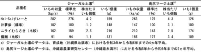 - 春植え栽培における収量は、「沖夢紫」や「備瀬」と比較して多収です。また、「ニライむらさき」で見られるような土壌型による収量の変動が「Hai-Saiすいーと」では小さく、ジャーガル土壌、島尻マージ土壌ともに多収となり土壌型を選びません。また、いも1個重は平均150g前後と、焼きいもに適したサイズです(表2)。