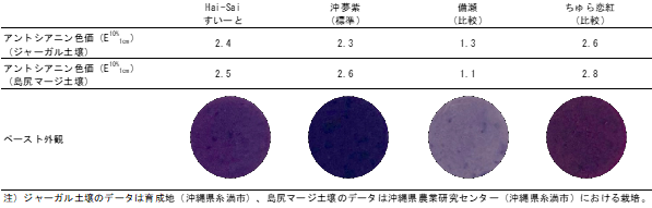 - 蒸しいもの肉質は"やや粘"で、繊維が少なく、蒸しいも、焼きいものBrix9)は「沖夢紫」と同程度で、食味もともに"やや上"と優れます。(表3)。また、肉色の濃さを示すアントシアニン色価も「沖夢紫」と同程度です(図3)。