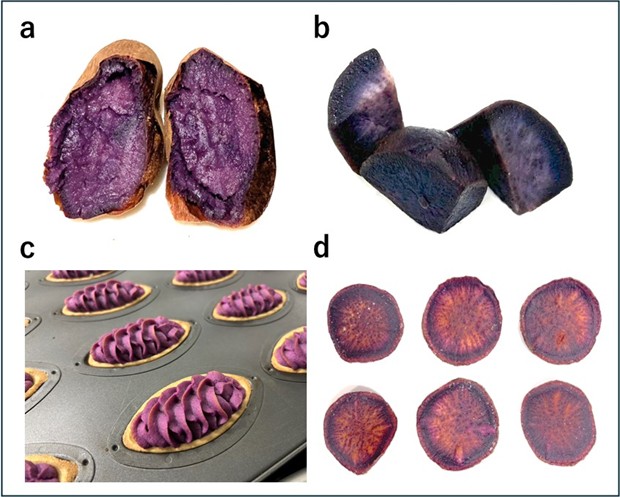 a:焼きいも、 b:ダイスカット、 c:紅芋タルト、 d:チップス