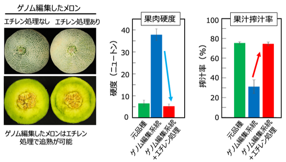 農研機構、筑波大学、サナテックライフサイエンス株式会社からなる研究チームは、メロンの日持ち性向上を目指すにあたり、メロンの果実の熟成(追熟)に関わる「CmACO1」という遺伝子に着目しました。CmACO1はエチレン2)という植物ホルモンを合成する酵素の遺伝子です。メロン果実は収穫後にエチレンを自ら放出し、それによって軟らかく甘くなりますが、適期を過ぎると傷みも進みます。CmACO1遺伝子をゲノム編集により不活化することで、エチレンが作られなくなり、「追熟が遅く、日持ちするメロン」ができると考えました。これまで、農研機構と株式会社カネカが共同開発した独自のゲノム編集技術「in planta Particle Bombardment(iPB)法」をメロンに適用することで、CmACO1遺伝子が不活化した植物体が得られ、期待通りエチレンの放出がほとんど見られないことがわかっていました(2023年 研究活動報告 https://www.naro.go.jp/project/research_activities/laboratory/nias/158244.html)。今回、iPB法によりゲノム編集されたメロンを作出し、日持ち性の評価を行ったところ、収穫後1ヶ月以上経っても果皮は緑色で、果肉も固いままでした(図1)。さらに、このゲノム編集メロンをエチレンにさらすことで、通常通り熟して食べ頃になることが確認できました。収穫後7日目に高濃度のエチレンを24時間処理したところ、処理終了後3日目には果肉が軟らかくなり、また果肉のみずみずしさも増して、通常の完熟メロンとほぼ同等の状態に達しました(図2)。これにより、必要なときに追熟を行う"オンデマンド型"の流通が可能となり、廃棄リスクの低減や輸出の拡大にも大きなメリットが期待されます。なお、このエチレンによる追熟法は輸入バナナでは一般的に用いられています。