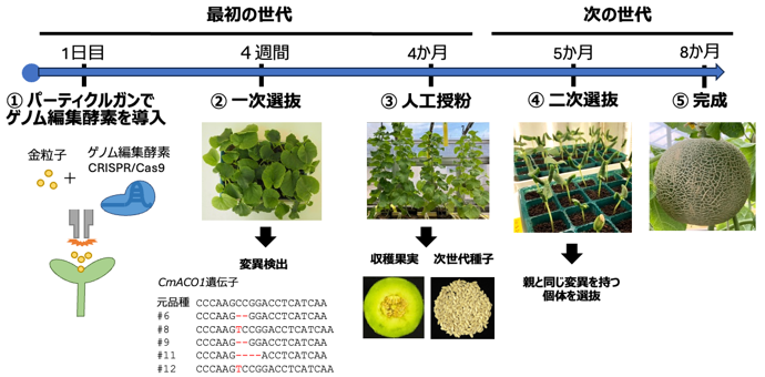 メロンは収穫後に急速に熟すため、日持ちが短く、食品廃棄の要因となるほか、長距離輸送や海外輸出には不向きとされてきました。農研機構は、筑波大学およびサナテックライフサイエンス株式会社と共同で、農研機構等が開発した独自のゲノム編集技術「in planta Particle Bombardment(iPB)法1)」をメロンに適用し、果実の熟成に関わる遺伝子を不活化することで、日持ち性が良く、食べ頃を調整できるマスクメロンの作出に成功しました。本成果により、国内の遠隔地への流通や海上輸送による海外への低コスト輸出が可能となり、メロンの国内消費の増加や海外展開の活性化につながることが期待されます。