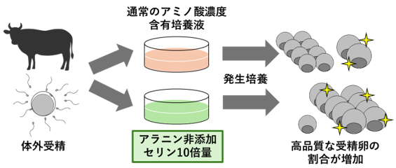 アラニンとセリンの濃度を変更したこの培養液を用いることで体外受精卵の移植後受胎率が改善される可能性があり、和牛の効率生産への貢献が期待されます。本技術は、特殊で高価な成分の添加を必要とせず、従来の培養液に使用している成分の濃度の調整のみで効果が得られることから、導入が容易です。今後は非必須アミノ酸濃度改変培養液の製品化に取り組み、受精卵生産現場に普及させることが目標です。