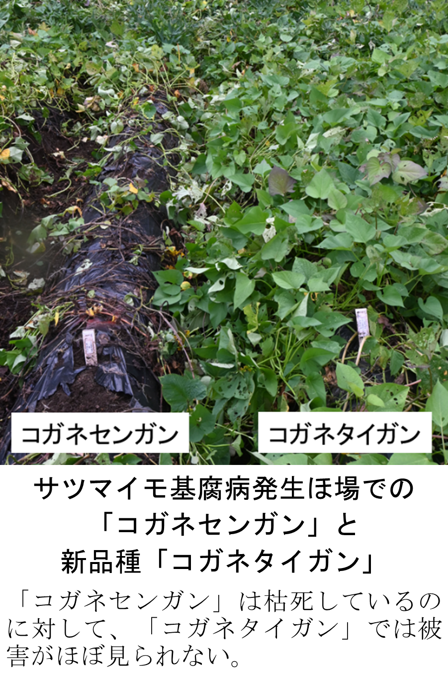 サツマイモは、南九州の基幹作物として農業生産ならびに地域経済において重要な品目となっており、南九州におけるサツマイモ生産量の7割以上がでん粉と焼酎の原料として使われています。しかし、サツマイモ基腐病(以下、基腐病)の発生により南九州のサツマイモ生産は深刻な被害を受けました。基腐病対策の推進により被害は減少傾向にあるものの、生産者の高齢化に伴う栽培面積の減少も相まって生産量は十分回復しておらず、とりわけでん粉の原料不足はいまだかつてない深刻な状況にあります。また、南九州では、基腐病を原因としない塊根腐敗症状の発生も問題となっています。この課題に対応するため、農研機構は、2021年に育成した「みちしずく」に続く原料用の基腐病抵抗性品種の第二弾として、「コガネタイガン」を育成しました。