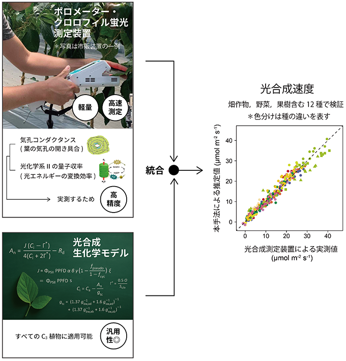 計測が容易な指標を組み合わせて光合成速度を効率よく推定できますが、実用的な装置はまだ開発されていません。本手法は、市販の装置だけで光合成速度を推定できるようにこの手法を単純化したものです。