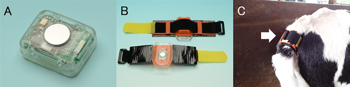農研機構では、過去10年以上にわたる家畜のスマート健康管理技術開発の取り組みの中で「多機能尾部装着型ウェアラブルセンサ」を開発しました。本デバイスは、加速度センサに加えて温度センサも搭載することにより、活動強度や起臥(立ち上がりや横たわり)、挙尾(しっぽを上げる動作)といった子牛の行動モニタリングに加え、体表温のリアルタイムモニタリングも可能としています。