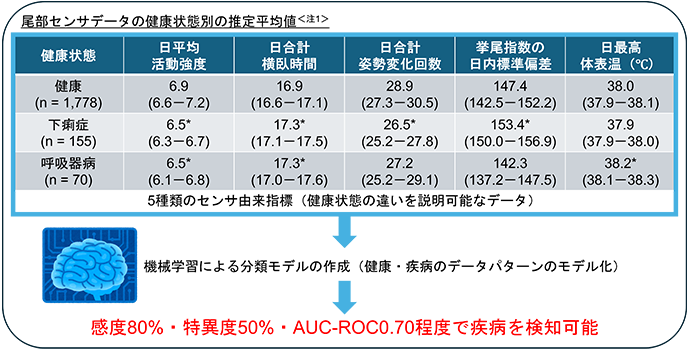 今回、農研機構、麻布大学、北海道立総合研究機構、明治大学、全国酪農業協同組合連合会の共同研究グループは、この多機能尾部センサを用いて、疾病罹患時における子牛の特徴解明に取り組みました。さらに、機械学習の手法を用いて、センサデータから疾病罹患牛を判別する疾病検知モデルを構築し、その有用性を評価しました。