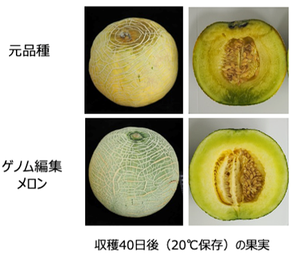農研機構、筑波大学、サナテックライフサイエンス株式会社からなる研究チームは、メロンの日持ち性向上を目指すにあたり、メロンの果実の熟成(追熟)に関わる「CmACO1」という遺伝子に着目しました。CmACO1はエチレン2)という植物ホルモンを合成する酵素の遺伝子です。メロン果実は収穫後にエチレンを自ら放出し、それによって軟らかく甘くなりますが、適期を過ぎると傷みも進みます。CmACO1遺伝子をゲノム編集により不活化することで、エチレンが作られなくなり、「追熟が遅く、日持ちするメロン」ができると考えました。これまで、農研機構と株式会社カネカが共同開発した独自のゲノム編集技術「in planta Particle Bombardment(iPB)法」をメロンに適用することで、CmACO1遺伝子が不活化した植物体が得られ、期待通りエチレンの放出がほとんど見られないことがわかっていました(2023年 研究活動報告 https://www.naro.go.jp/project/research_activities/laboratory/nias/158244.html)。今回、iPB法によりゲノム編集されたメロンを作出し、日持ち性の評価を行ったところ、収穫後1ヶ月以上経っても果皮は緑色で、果肉も固いままでした(図1)。さらに、このゲノム編集メロンをエチレンにさらすことで、通常通り熟して食べ頃になることが確認できました。収穫後7日目に高濃度のエチレンを24時間処理したところ、処理終了後3日目には果肉が軟らかくなり、また果肉のみずみずしさも増して、通常の完熟メロンとほぼ同等の状態に達しました(図2)。これにより、必要なときに追熟を行う"オンデマンド型"の流通が可能となり、廃棄リスクの低減や輸出の拡大にも大きなメリットが期待されます。なお、このエチレンによる追熟法は輸入バナナでは一般的に用いられています。
