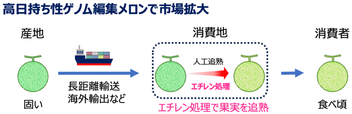 本成果は、生産者にとっては収穫のタイミングを柔軟に決められる、流通業者にとっては収穫後の鮮度保持や輸送に関わるコストを削減できる、消費者にとっては旬の時期にしか味わえなかった果物をより長い期間楽しめる等のメリットがあり、メロンの国内需要の拡大や輸出促進に向けた大きな一歩といえます。今後、関係省庁への届出や品種登録を行い、3年後を目処に市場への投入を目指します。