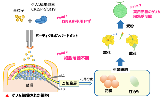 メロンは収穫後に急速に熟すため、日持ちが短く、食品廃棄の要因となるほか、長距離輸送や海外輸出には不向きとされてきました。農研機構は、筑波大学およびサナテックライフサイエンス株式会社と共同で、農研機構等が開発した独自のゲノム編集技術「in planta Particle Bombardment(iPB)法1)」をメロンに適用し、果実の熟成に関わる遺伝子を不活化することで、日持ち性が良く、食べ頃を調整できるマスクメロンの作出に成功しました。本成果により、国内の遠隔地への流通や海上輸送による海外への低コスト輸出が可能となり、メロンの国内消費の増加や海外展開の活性化につながることが期待されます。