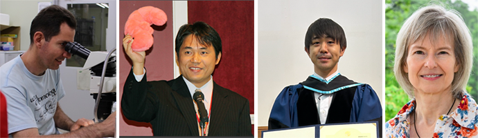 左から順に、農研機構 生物機能利用研究部門 生物素材開発研究領域 機能利用開発グループ 上級研究員 コルネット リシャー、グループ長補佐 黄川田 隆洋、東京大学 大学院新領域創成科学研究科 博士課程(当時) 布施 寛人、メリーランド大学 Elisabeth Smela教授。