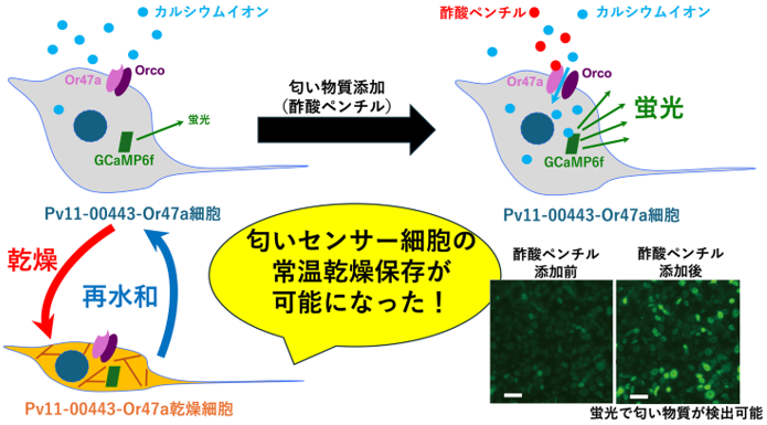 概要 : Pv11培養細胞に、バナナなどの果実の香り成分である酢酸ペンチルを検知するショウジョウバエ由来の嗅覚受容体Or47aを導入し、匂いを検知したことを蛍光で知らせるシステムも組み込んだ匂いセンサー培養細胞を作りました。この培養細胞は、常温乾燥保存しても、再水和後には酢酸ペンチルに対して乾燥前と同レベルの応答を示しました。この成果は、常温乾燥保存が可能な匂いバイオセンサーの開発に向けた第一歩として重要です。