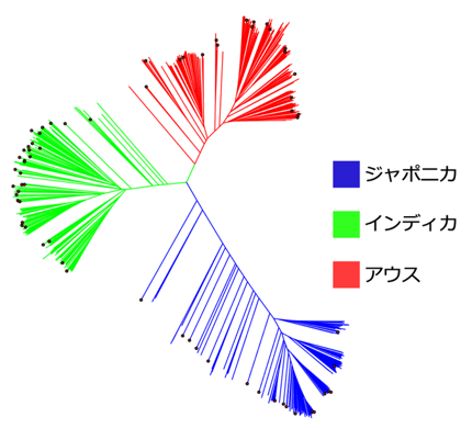 既存のコアコレクションWRCとJRCを基に系統数を623に拡大したNRCを作り、これらの高精度ゲノム情報を取得しました。この623系統は、栽培イネの3つのサブグループ(ジャポニカ、インディカ、アウス2) )からバランス良く選ばれており、世界のイネの遺伝的多様性を網羅していると考えられます(図1 )。