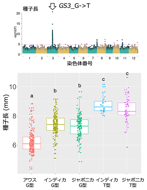 〈上〉NRCの623系統のゲノム配列情報と種子長の関係を解析した結果です。既報のとおり、種子の長さに関わるGS3 遺伝子上のGからTへの塩基置換が種子長に大きな影響を及ぼしていることが示されました。