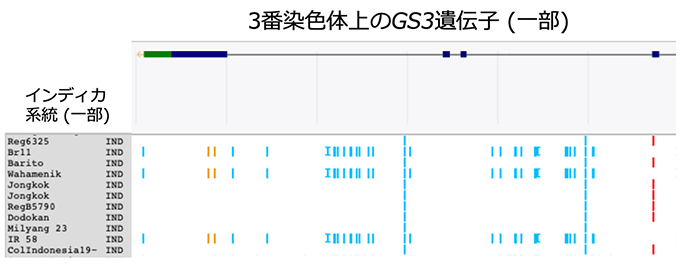 例として一部のインディカ系統間におけるGS3 遺伝子の配列の違いを示しています。一番上の横に伸びる黒線、および濃紺の横長の細い長方形はGS3 遺伝子の構造を示しており、濃紺の長方形はタンパク質へ翻訳されるゲノム配列の領域、黒線と緑色の長方形は翻訳されない領域を示しています。図の下の縦線は遺伝的多型を示します (Iは塩基の挿入)。水色は、タンパク質をコードしていない領域で遺伝子の機能に影響が小さいと予測されるもの、橙色は、アミノ酸が変化するため影響が中程度と予測されるもの、赤色は、タンパク質の合成が途中で止まるため影響が大きいと予測されるものです。赤色の縦線は、図3 で記述した種子の長さを長くする効果を持つ塩基GからTへの変化(多型)を示しています。