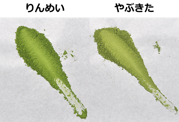 写真3.一番茶期に17日間被覆栽培して製造した「りんめい」と「やぶきた」の粉末茶の色沢