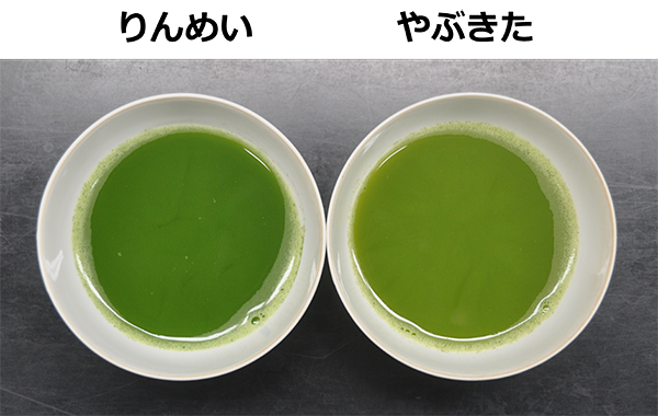写真4.一番茶期に17日間被覆栽培して製造した「りんめい」と「やぶきた」の粉末茶の水色