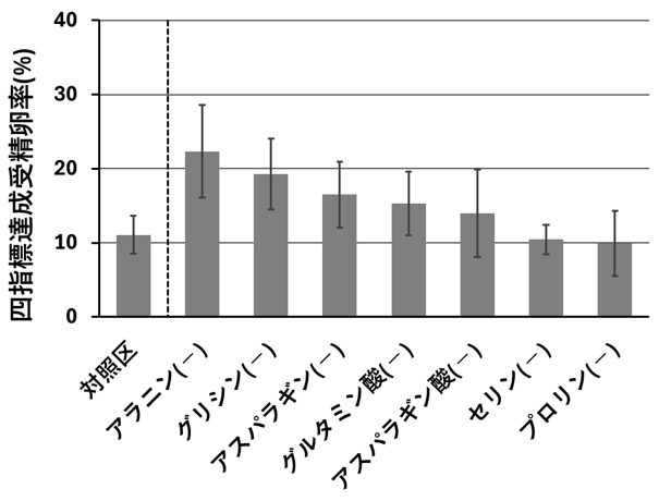 7種類の非必須アミノ酸を0.1 mMの濃度で添加した培養液を対照区とし、非必須アミノ酸を1種類ずつ非添加とした培養液を合計7種類作製し、対照区を含めた8種類で四指標達成受精卵率4) を比較しました。
