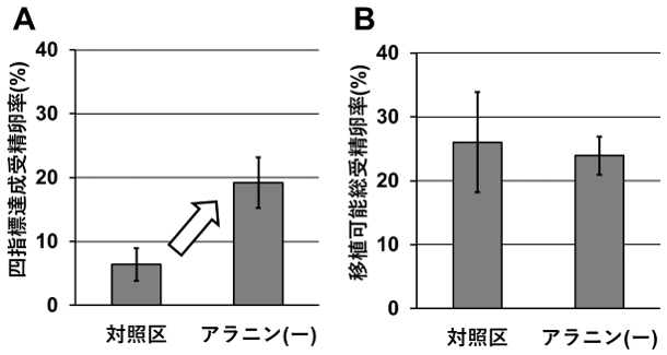 そこでアラニン非添加培養液についてさらに実験回数を重ねたところ、対照区との間に四指標達成受精卵率の有意な差が観察されました(図3 A)。なお移植可能総受精卵率5) は、アラニンの有無では差がなかったことから(図3 B)、アラニン非添加による効果は四指標に基づく評価を行うことで見えてきたと言えます。
