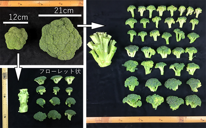 図1 青果用花蕾(12cm径)と加工・業務用の大型花蕾(21cm径)をフローレットに分解した様子