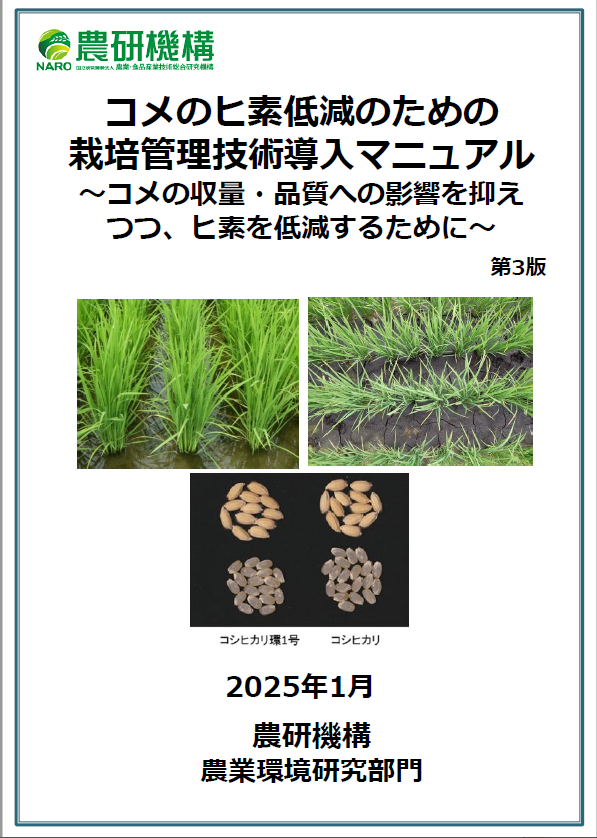 コメのヒ素低減のための栽培管理技術導入マニュアル ~コメの収量・品質への影響を抑えつつ、ヒ素を低減するために~ (第3版) | 2025年1月20日 |