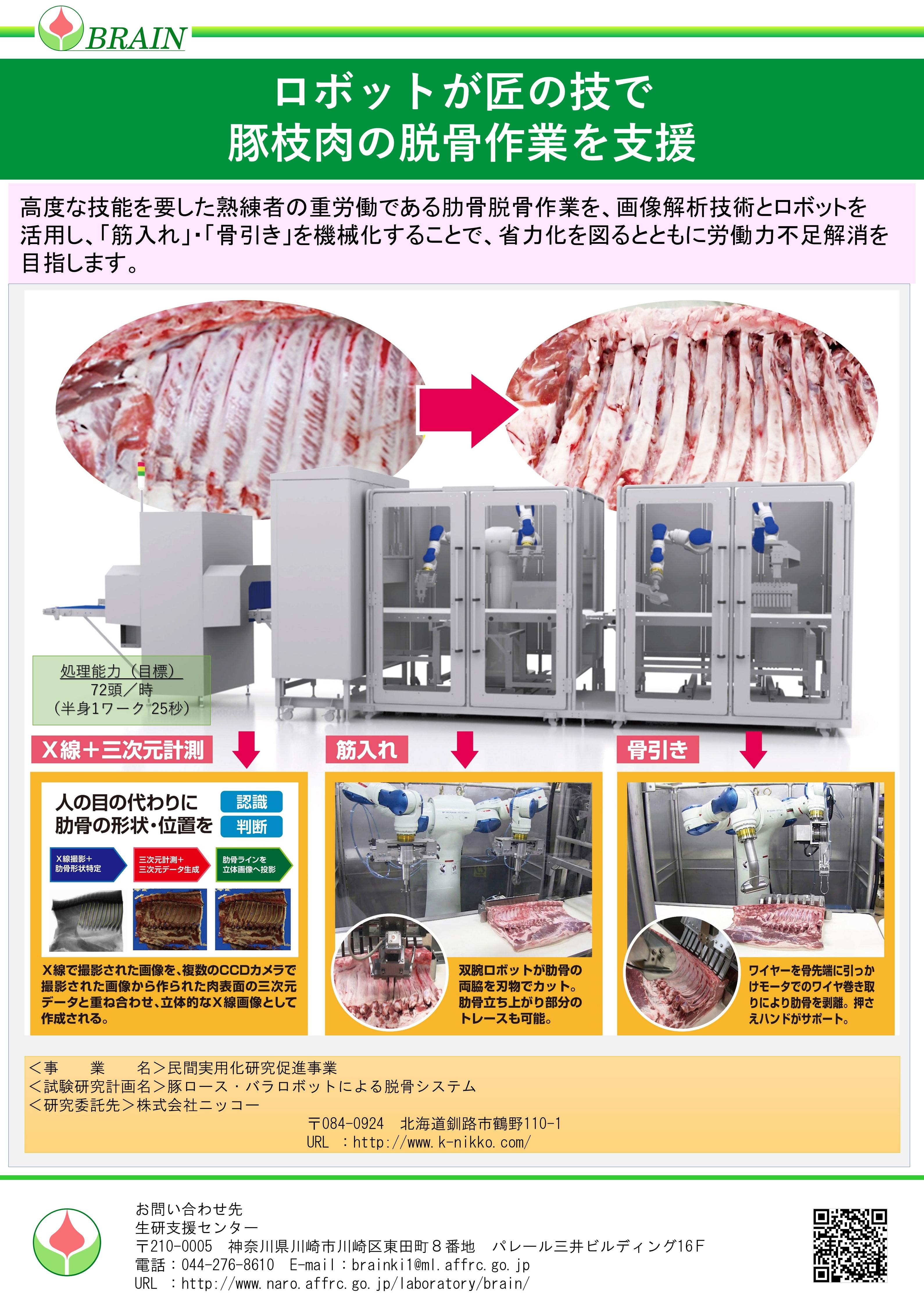 豚の部分肉の脱骨作業は重労働で、高度な技能による熟練を要する作業ですが、熟練作業員の高齢化に伴い労働力の確保が課題となっています。 本試験研究は、豚バラブロックをX線データとCCDカメラによる三次元データを組み合わせた画像解析技術、および筋入れと骨引きのロボット化技術を活用して、豚ロース・バラ脱骨作業のうち肋骨の脱骨を自動化する装置を開発し、熟練作業員の不足に対応しようとするものです。