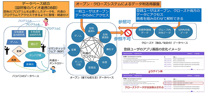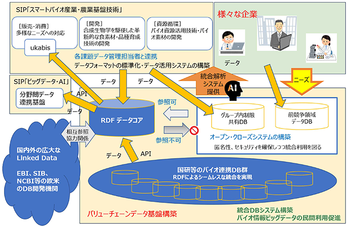 SIPスマートバイオ産業・農業基盤技術「バリューチェーンデータ基盤構築」コンソーシアムでは、民間企業によるビッグデータの利用を促進し製品開発を活性化するために、公的研究機関等が蓄積し保有するバイオ関連のデータベースや、SIPバイオ農業の研究開発によって生み出されている研究成果のデータベースを統合的に検索・利用できるようにする「バイオDB連携・統合利用システム」の仕組み作りやルール整備を行っています。これにあわせて企業が保有する秘匿性の高いデータや国の委託プロジェクトにおける公開前の研究データなどクローズドデータのセキュリティを確保しながら、公開済みのデータと融合して有効活用するためのオープン・クローズシステムの開発を行っています。