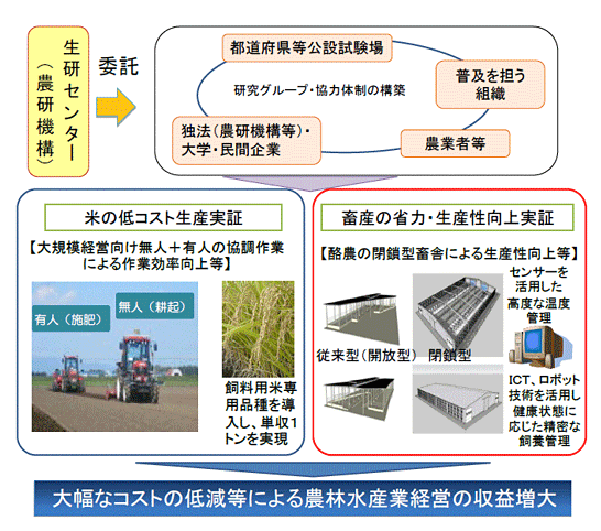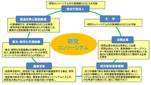 このため、本事業では、民間・大学・独法などのオールジャパンの英知を結集して、革新的な技術体系を確立するための実証研究や民間活力を生かした技術開発等へ支援を行い、消費者等のニーズに応えます。その際には、消費者や実需者のニーズに立脚したものとなるよう、大学等の協力を得て、マーケティングや経営分析研究も併せて実施します。