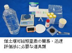 土壌中の養分の過不足や土壌硬度、排水不良は作物の生育に影響を及ぼすので、適正な施肥や土壌管理により、土壌を良好な状態に保つ必要があります。そのためには、それぞれの圃場の状態を把握するための土壌の化学性や物理性の診断をすることが重要です。これまで、本研究グループでは都道府県施肥基準やその関連資料に基づいて、施肥基準、減肥基準、有機物施用基準、土壌診断基準のデータベースを作成したほか、現場対応型診断法として畑土壌可給態窒素および可給態リン酸の簡易・迅速評価法の開発を行ってきました。また、土壌管理が環境負荷物質の発生に及ぼす影響を解明するために、露地野菜のマルチ被覆栽培におけるポリマルチ透過による一酸化二窒素発生量の把握手法の開発などを行いました。現在は、水田土壌の窒素やリン酸の肥沃度の指標となる可給態窒素や可給態リン酸を簡易、迅速に判定する方法の開発に取り組んでいます。また、ジャガイモそうか病の発生に関係する土壌酸度を従来に比べて簡便に評価する手法の開発を行っています。土壌の物理性については、コアサンプラ・貫入式土壌硬度計などの機器類や航空写真などを活用して排水性などを面的に評価する研究を行っています。これらの研究は、プロジェクトなどで公設試験場と連携して進行しているほか、生産者の現地圃場も対象として実施しています。土壌の化学性や物理性を測定する一般的な機器類は、本研究グループないし土壌肥料研究領域の共有物として整備されており、土壌診断や土壌診断に基づく施肥や土壌管理に関心をお持ちの方々との連携を歓迎します。