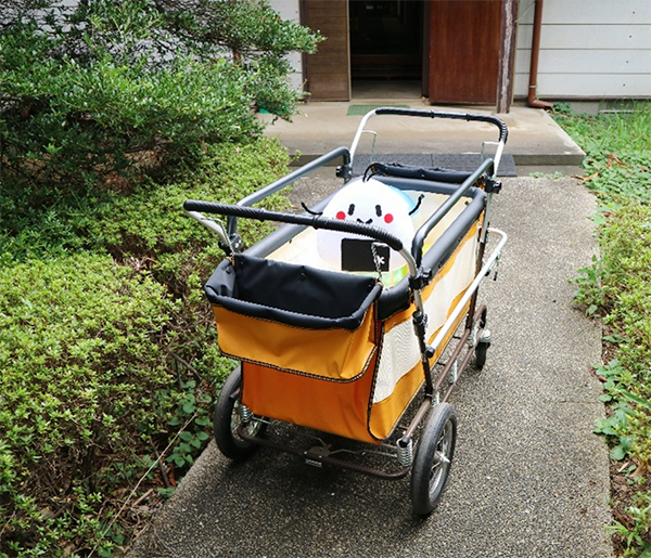 ベビーカーは避難時のためにあるんだけど、特別に乗せて貰ったよ。