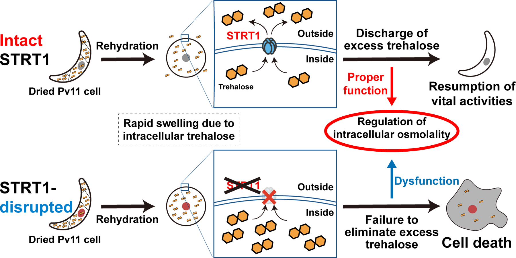 Pv11 cells, a cultured cell line derived from the sleeping chironomid Polypedilum vanderplanki that exhibits extreme desiccation tolerance, can be preserved in the dry state at room temperature for long term while retaining the capacity to resume proliferation. Nevertheless, the precise mechanism by which they resume their vital functions remains to be elucidated. A joint research team led by National Agriculture and Food Research Organization(NARO) has revealed that the recently isolated trehalose transporter STRT1 is responsible for the efficient release of trehalose, which acts as a desiccation protection in desiccated cells, into the extracellular medium upon rehydration. Read more