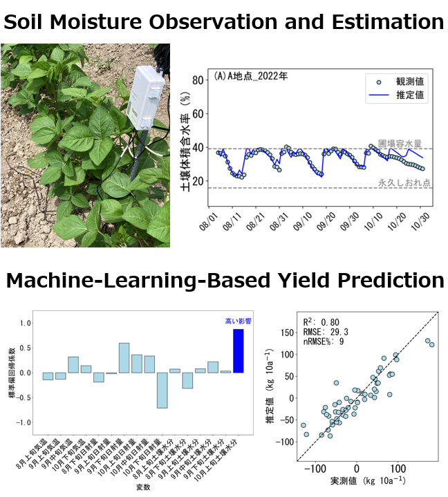 To support stable production of Tamba black soybeans, NARO analyzed cultivation data accumulated over 16 years from farmers' fields and identified meteorological and soil moisture factors influencing yield. By combining the Soybean Irrigation Support System with a machine-learning-based yield prediction model, the study revealed that water management in early October plays an important role in stabilizing yields. This achievement represents a step toward sustainable black soybean cultivation under climate change.
