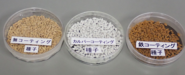 写真1:無コーティング種子(左)、カルパーコーティング種子(中)、鉄コーティング種子(右)