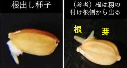 研究グループは、苗立ちをさらに安定させるために、籾から根だけを0.5~5 mmほど伸ばした「根出し種子」(写真2)を開発しました。ただ根出し種子は根を伸ばしすぎると播種機の目詰まりにつながるため注意が必要です。