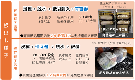 「根出し種子」の誕生には、偶然の発見もありました。研究の実証において、播種用の種子のうち根だけ伸びたものがあり、試しに播いたところ出芽が異様に早く、苗立ちも良かったのです。そこから「根出し種子」の大量製造法の開発が始まり、育苗器や催芽器を利用して一度に100 kg作製する技術を確立しました(図3)。育苗器を所有していない生産者も作業できるよう、より多くの生産者に使用されている催芽器を用いる方法です。また、根出し種子の保存方法や保存可能期間(15~20日)も明らかにしました。