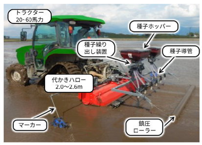 代かきと同時に無コーティング種子をごく浅い土中に播く播種機(幅2.0~2.6 m、写真3)は、株式会社石井製作所(山形県、https://isi-mfg.com/items/an201-hrs-un2)において実用化・販売されており、トラクターに取り付けて利用されています。東北・北陸地方を中心に、北海道から九州まで全国で導入され、2025年度時点で販売台数は累計129台、普及面積は約520 haに上っています。