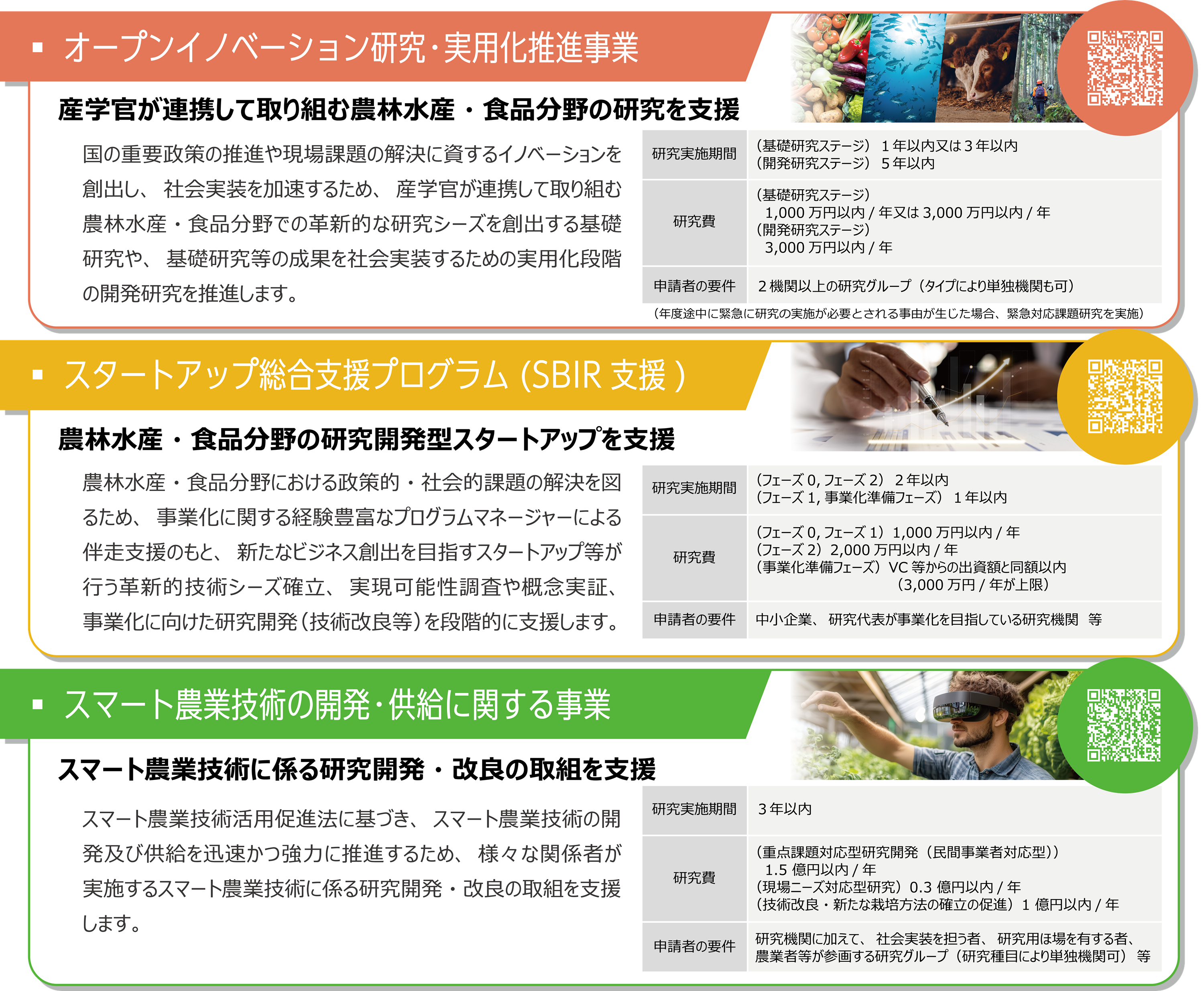 生研支援センターでは、農林水産業・食品産業分野等で、民間企業、大学、国立研究開発法人などから優れた提案を募り、研究資金を提供し目標が達成されるように課題管理を行うとともに、その成果の社会実装を推進しています。