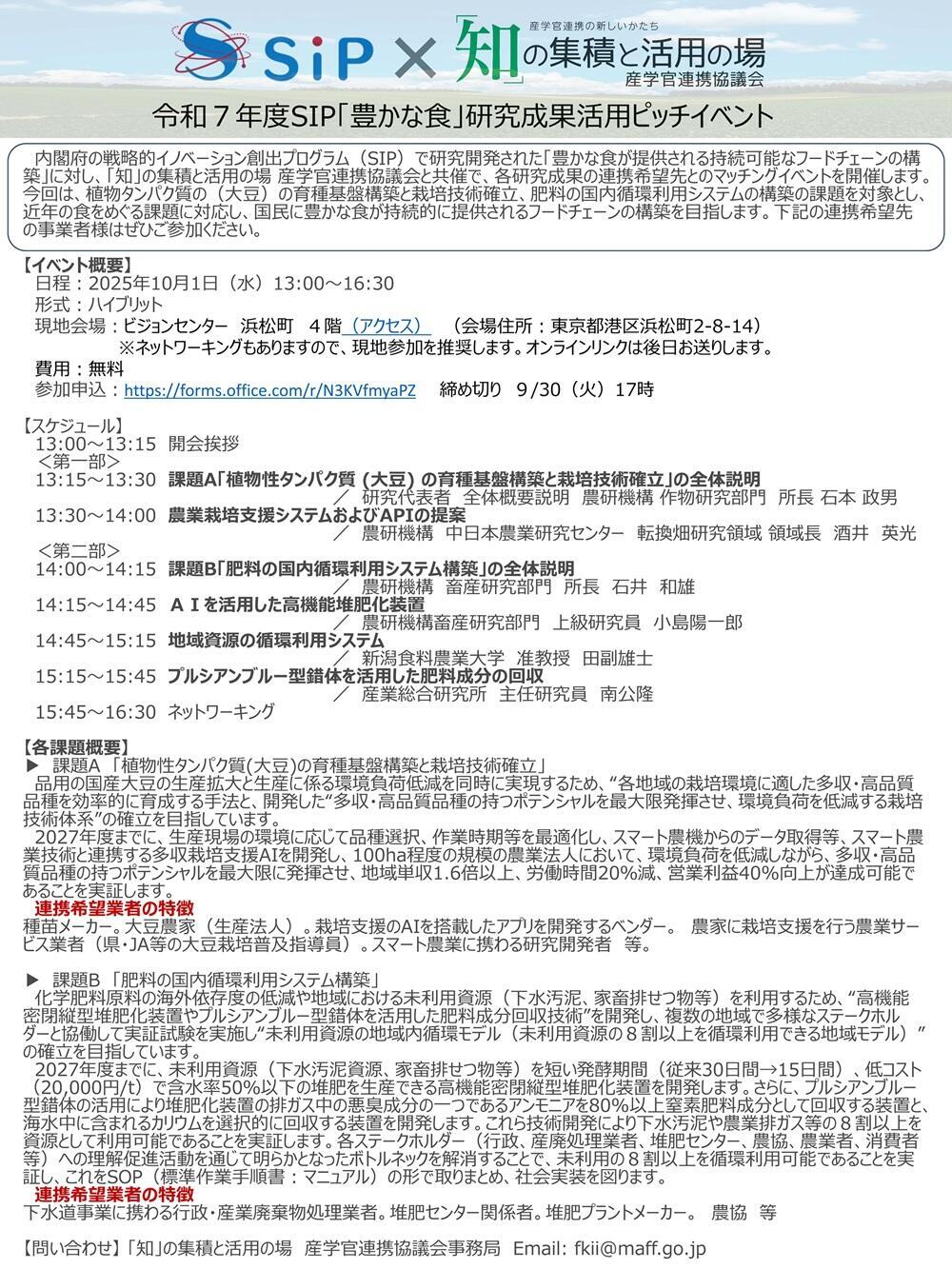 内閣府の戦略的イノベーション創出プログラム(SIP)で研究開発された「豊かな食が提供される持続可能なフードチェーンの構築」に対し、「知」の集積と活用の場 産官学連携協議会と共催で、各研究成果の連携希望先とのマッチングイベントを開催します。