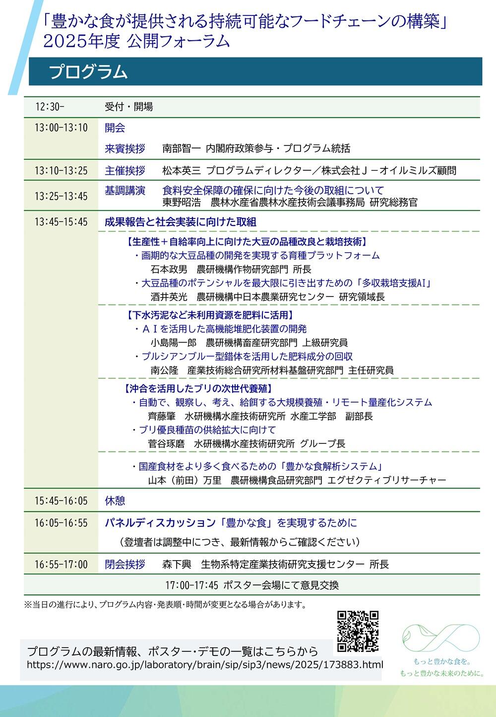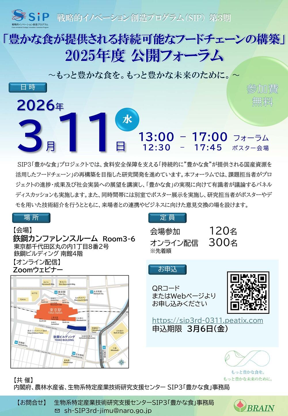 SIP3「豊かな食が提供される持続可能なフードチェーンの構築」プロジェクトは2025年度公開フォーラムを3月11日(水曜日)に開催いたします。