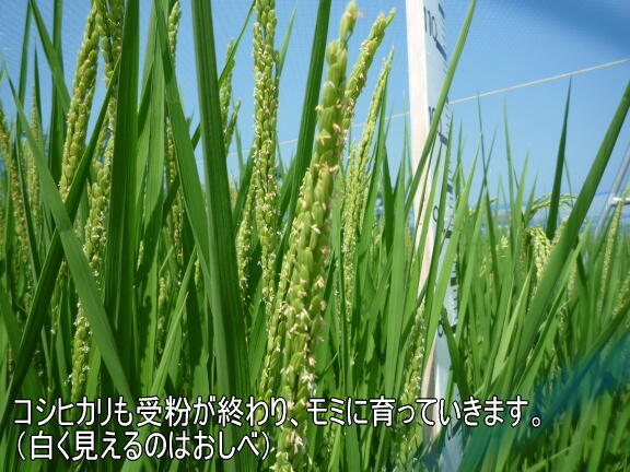 イネは、穂(ほ)が出(で)るとまもなく花(はな)が咲(さ)き、受粉(じゅふん)します。花(はな)が咲(さ)いているのは朝(あさ)から午前中(ごぜんちゅう)の2時間くらいだけです。