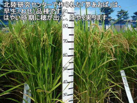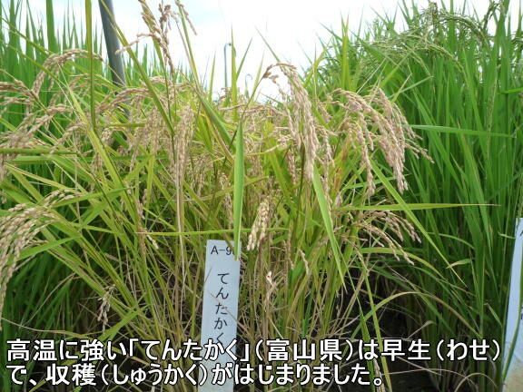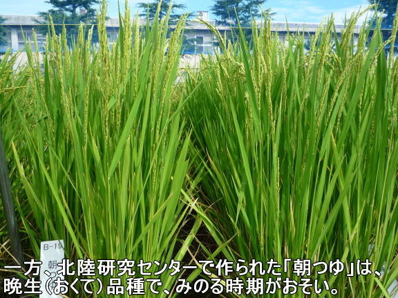 イネの生長(せいちょう)は、北(きた)・南(みなみ)の違(ちが)いのほかに、実(みの)る時期(じき)の早(はや)さにより早生(わせ)、中生(なかて)、晩生(おくて)に分(わ)けられています。