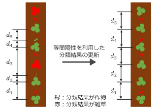 概 要 作物がほ場の中で直線的かつ等間隔に配置されていることを利用して、画像中の作物を検出する手法。従来手法と異なり、機械学習に重要な作物・雑草の形状や色などの特徴量の分布に関する事前知識や、学習用画... |