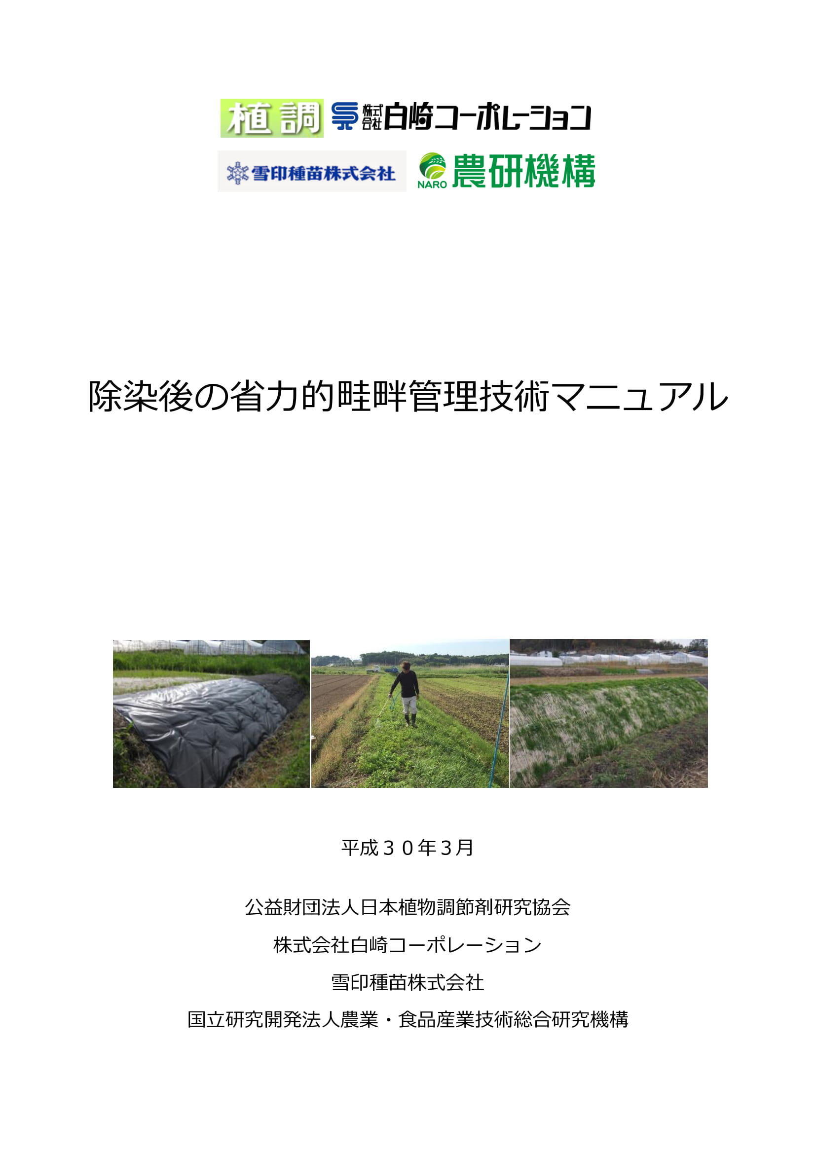 ワラ芝(クリーピングベントグラス)、薬剤散布(抑草剤、除草剤)、防草シートの説明があります。これらの技術の作業時間やコストの比較が掲載されています。原発事故での除染農地のために作成されましたが、省力的に管理したい全国の農地で適用できます。