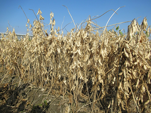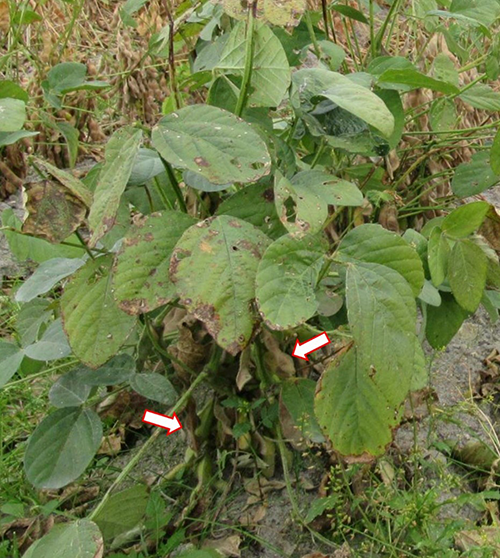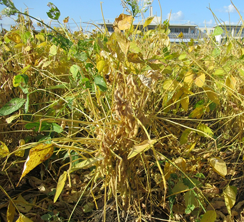 ちなみに、青立ちは莢先熟(さやせんじゅく)とも呼ばれる現象で、下の写真のように莢(矢印)は熟しているけど、黄化・落葉・茎の乾燥が進まない状況になってしまうことです。無理にコンバインで収穫すると、茎や葉の汁が豆について汚れてしまい、商品価値を大きく下げてしまう困りものの現象です。
