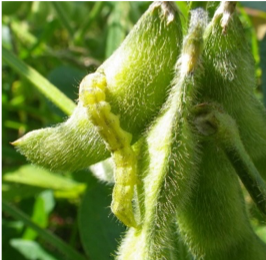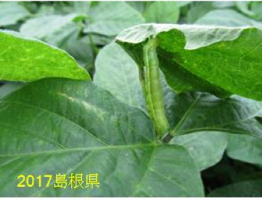 被害の様子:幼虫は葉を食害する。 発育に伴い食害量も多くなり、葉脈を残し葉を食べ尽くすことも多い。 老熟幼虫は若莢も食害し、子実が肥大している莢では円形に子実を食害する。 他の食葉性チョウ目害虫も酷似した葉の被害を生じさせる。 加害種の特定には、幼虫を確認する必要がある。
