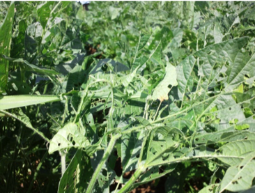 被害の様子:本種は卵塊で産卵しないため、 幼虫が群生して食害することがなく、ハスモンヨトウの被害のような白変葉にはならない。 葉の他に莢も食害する。