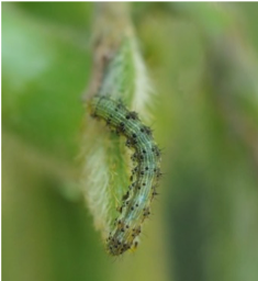 防除:初期被害は、幼虫は若葉をつづり合わせて食害するので注意を払い、 着爽後は莢のなかへ入らないようにする。 よって、防除は初期被害発生時に1~2回、落花後は10日おきに2~3回散布する。